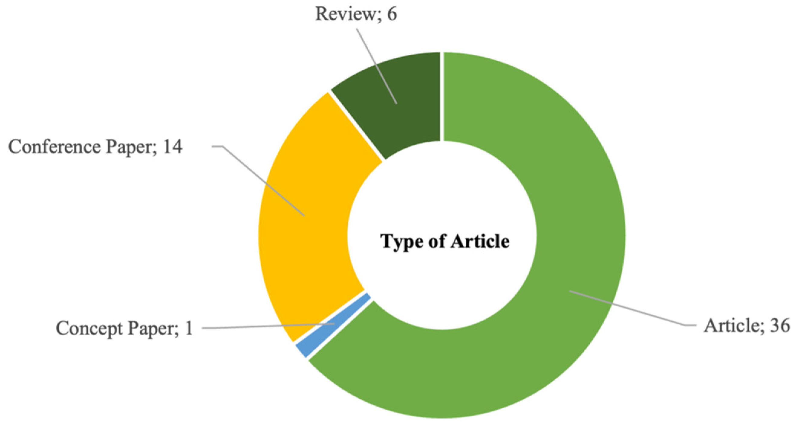 تحلیل دوم بررسی نوع مقالاتی بود که در این موضوع نوظهور تولید و منتشر شدهاند. از ۵۷ مقالهای که برای این مطالعه مرور سیستماتیک انتخاب شدند، اکثر آنها مقالات پژوهشی (Research Articles) هستند، یعنی ۳۶ مقاله، و پس از آن ۱۴ مقاله کنفرانسی قرار دارند. در این دوره کوتاه زمانی، شش مقاله مروری (Review) بر موضوعات و جنبههای مختلف صنعت ۰۵ تاکنون انجام شده است (شکل ۳).