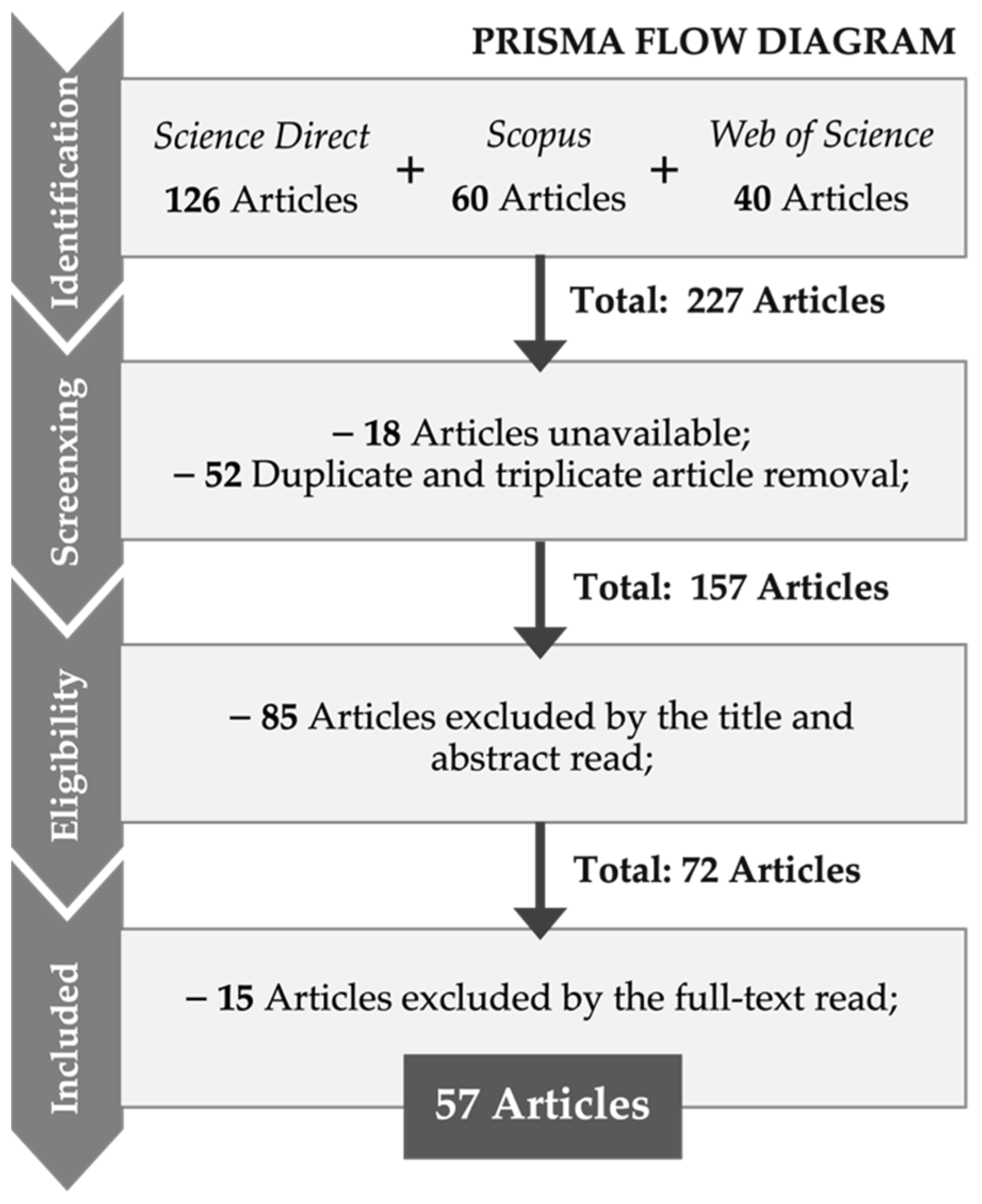 سپس صلاحیت این ۷۲ مقاله با مطالعه متن کامل آنها بررسی شد؛ در این مرحله ۱۵ مقاله به دلیل عدم تطابق با هدف مطالعه حاضر حذف شدند. در نهایت، ۵۷ مقاله باقیمانده تحلیل شده و در این مرور سیستماتیک ادبیات علمی گنجانده شدند (به شکل ۱ مراجعه شود).