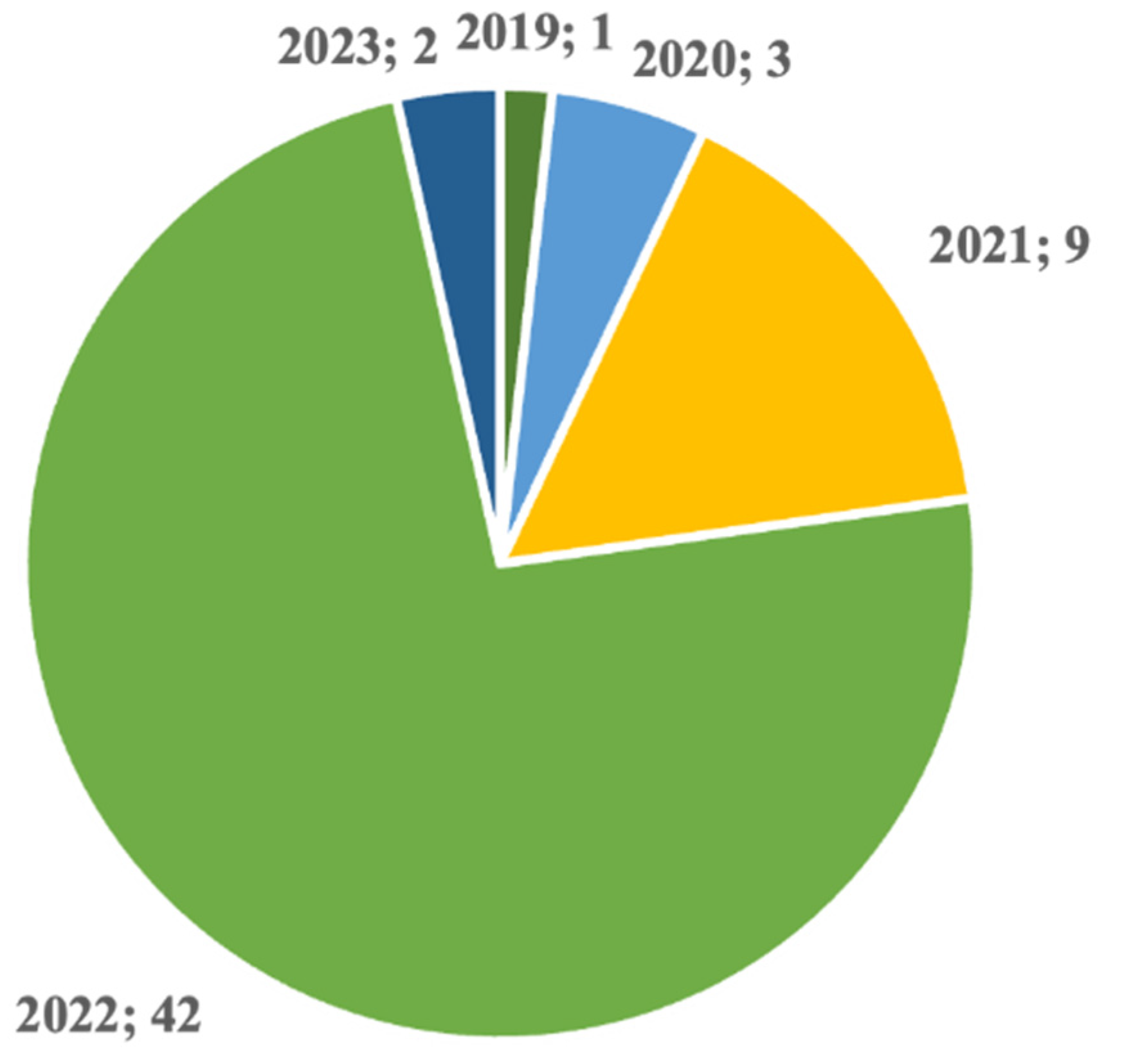 اولین تحلیلی که در این مقاله مرور سیستماتیک انجام شد، تمرکز بر تاریخ انتشار، مکان و نوع مقالاتی بود که واجد شرایط بوده و در مطالعه گنجانده شدند. با اینکه هیچ محدودیت زمانی در جستجو اعمال نشده بود، تاریخ انتشار مقالات بسیار اخیر و بین سالهای ۲۰۱۹ تا ۲۰۲۳ است، که نشاندهنده افزایش پژوهشها در حوزه مفاهیم صنعت ۰۵ و انسانمحوری است؛ بهویژه، تعداد زیادی از مقالات در سال ۲۰۲۲ منتشر شدهاند (شکل ۲).