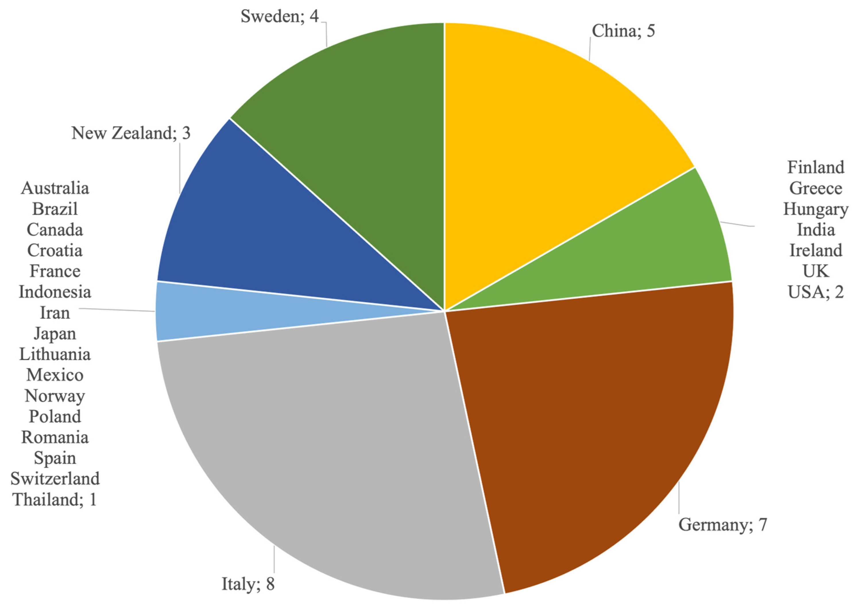 یکی دیگر از ویژگیهایی که مورد ارزیابی قرار گرفت، توزیع جغرافیایی انتشار مقالات بود، که در شکل ۴ نشان داده شده است. برای این منظور، مکان نویسنده اول یا وابستگی سازمانی مربوطه برای تمام مقالات گنجانده شده در مرور انتخاب شد تا یک فرآیند یکنواخت و هماهنگ دنبال شود. کشورهایی که بیشترین تعداد مقالات منتشر شده را داشتند، عبارتند از: ایتالیا و آلمان، و پس از آن چین، سوئد و نیوزیلند قرار دارند. این کشورها دارای سطح بالایی از توسعه صنعتی هستند و بنابراین پتانسیل بالایی برای پژوهش و نوآوری دارند.